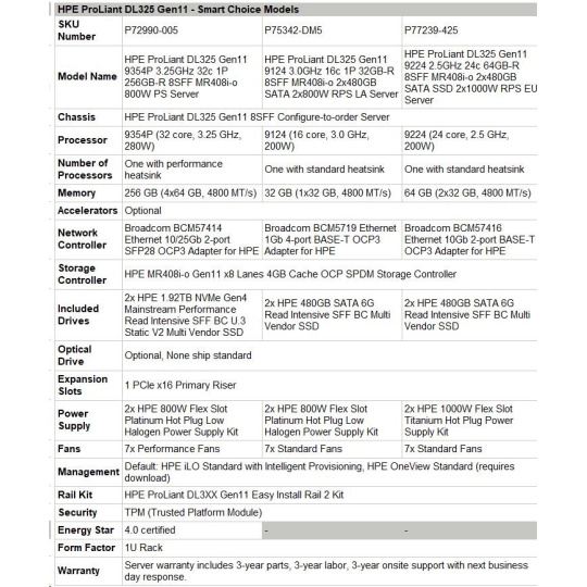 | Management | Default: HPE iLO Standard with Intelligent Provisioning, HPE OneView Standard (requires download) |
