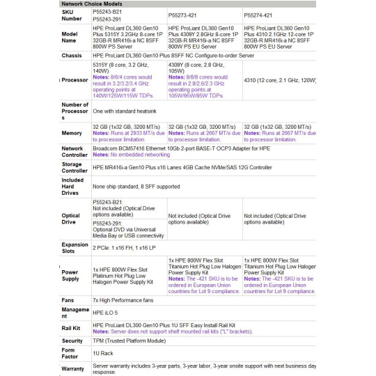 Model Name HPE ProLiant DL360 Gen10 Plus 4309Y 2.8GHz 8-core 1P 32GB-R MR416i-a NC 8SFF 800W PS EU Server