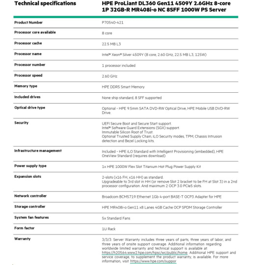 Model Name HPE PL DL360g11 4509Y (2.6G/8C) 1x32G MR408i-o/4G 8-10SFF 1x1000W 2x1G NBD333 1U