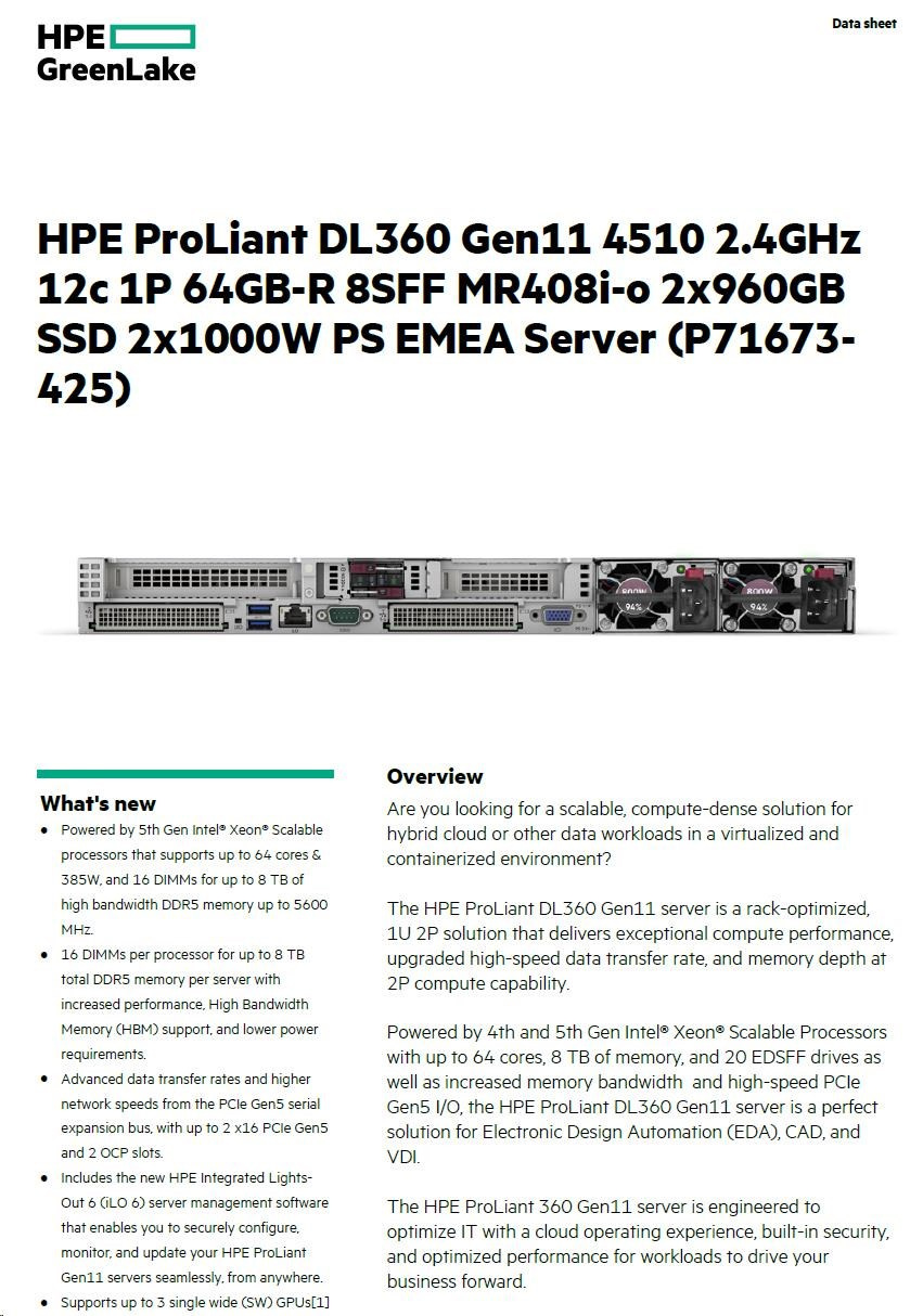HPE ProLiant DL360 Gen11 4510 2.4GHz 12c 1P 64GB-R 8SFF MR408i-o 2x960GB SSD 2x1000W PS EMEA Server