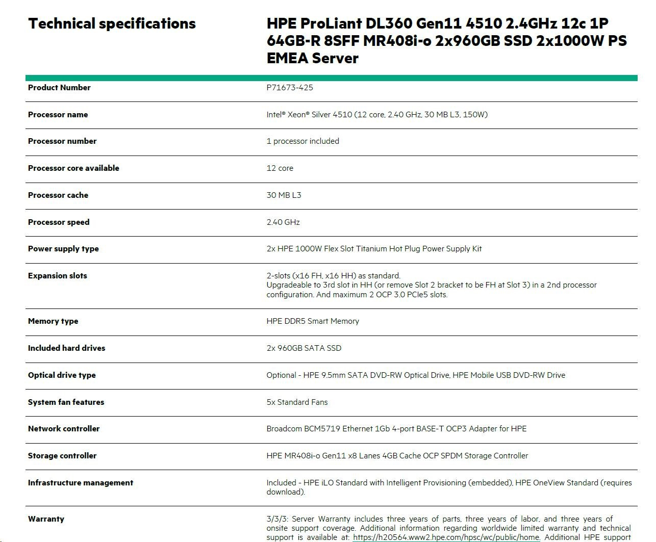 Server warranty includes 3-year parts, 3-year labor, 3-year onsite support with next business day response.