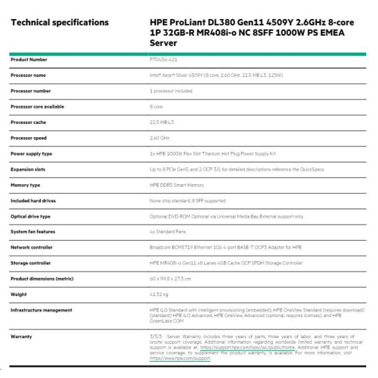 Model Name HPE PL DL380g11 4509Y (2.6/8C/22.5M) 32G MR408i-o/4G 8-26SFF 1000Wti 4x1G NDB333