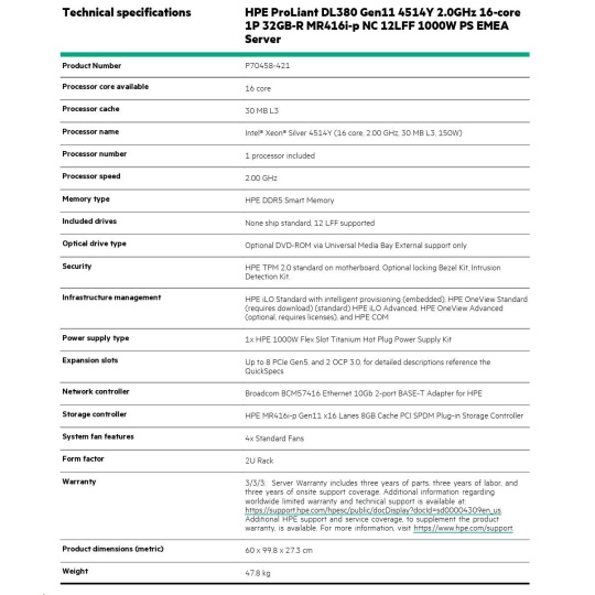 HPE PL DL380g11 4514Y (2.0/16C) 32G (p64706) MR416i-p/8G 12LFF 1000W 2p10G-T NBD333 2U P70458-421 RENEW