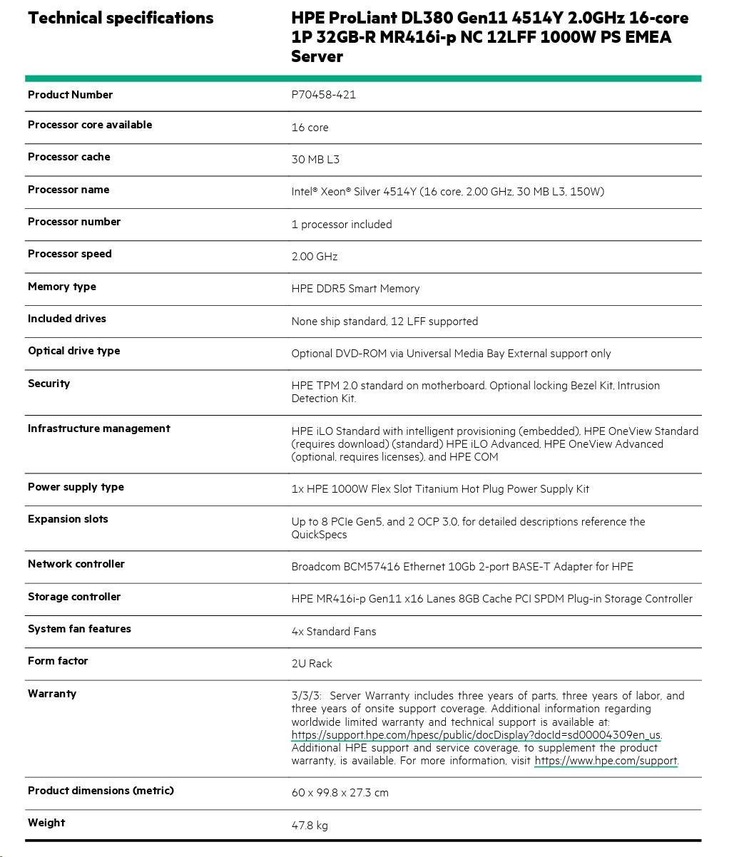 Model Name HPE PL DL380g11 4514Y (2.0/16C/30M) 32G MR408i-o/4G 12LFF 1000Wti 2x10G-T