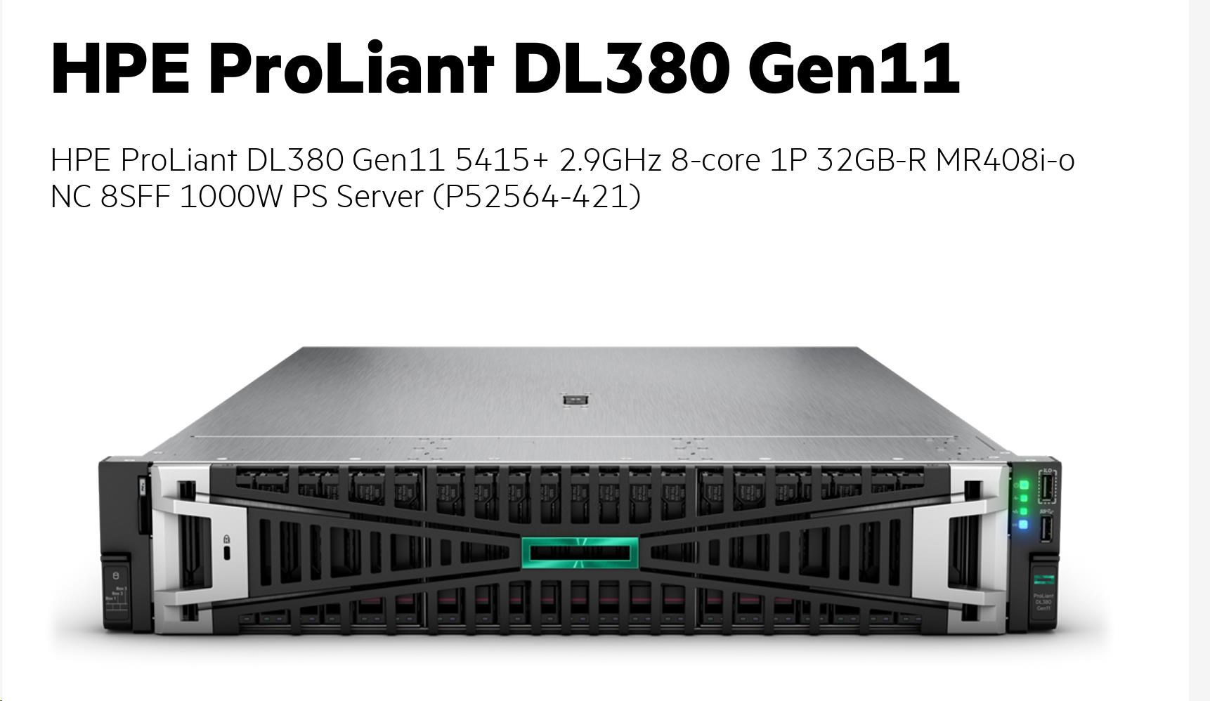 Model Name HPE PL DL380g11 5415+ (2.9/8C/23M/4400) 32G MR408i-o/4G 8-26SFF 1000Wtit 2x10G iLO6 base-T 2U NBD333