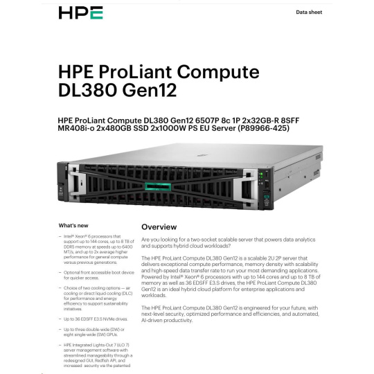 HPE PL DL380 Gen12 6505P (2.2/12C) 2x32G (P69727) 2x480G MR408i-o 8SFF 2x1000W 10GbE NBD333 Smart Choice.