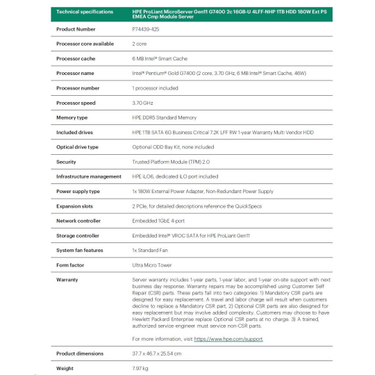 | P74439-425: HPE ProLiant MicroServer Gen11 G7400 2c 16GB-U 4LFF-NHP 1TB HDD 180W Ext PS EMEA Cmp Module Server |