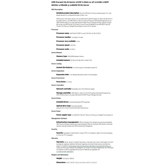 HPE PL ML30g11 6325P (3.5G/4C8T) 1x32G 8SFF NS204i-u(2x480g) MR408i-p/4G 2x800W 3/1/1 Smart Choice.