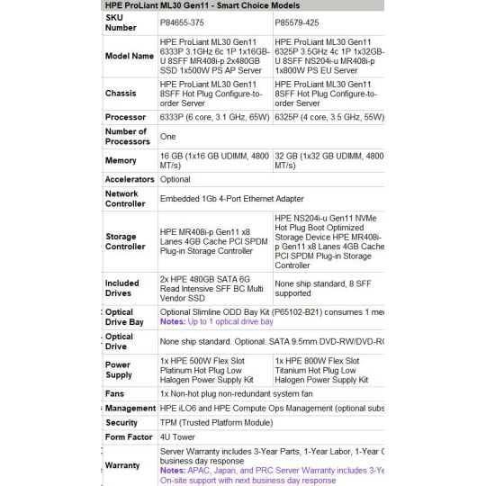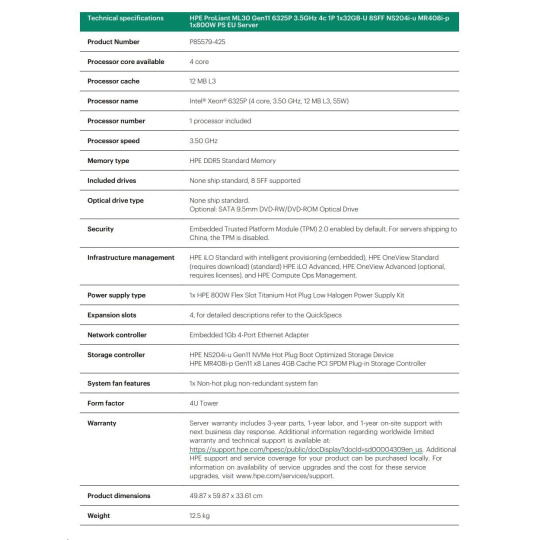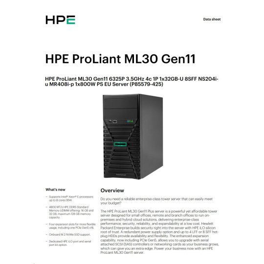 HPE PL ML30g11 6325P (3.5G/4C8T) 1x32G 8SFF NS204i-u(2x480g) MR408i-p/4G 2x800W 3/1/1 Smart Choice