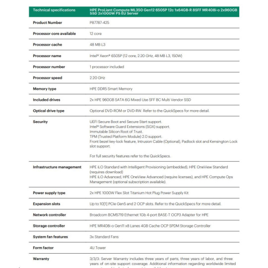 HPE PL ML350 Gen12 6505P (2.2/12C) 1x64G (P69728) 2x960G MR408i-o 8SFF 2x1000W 1GbE NBD333 Smart Choice.