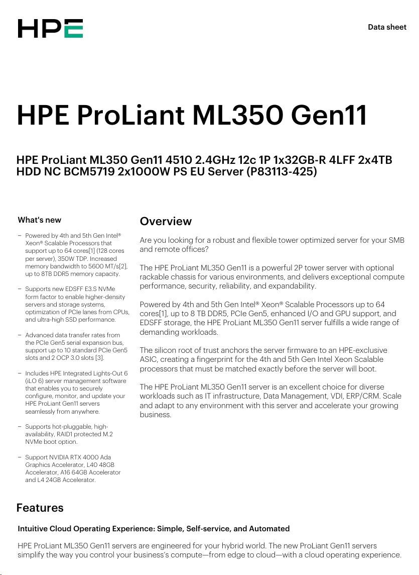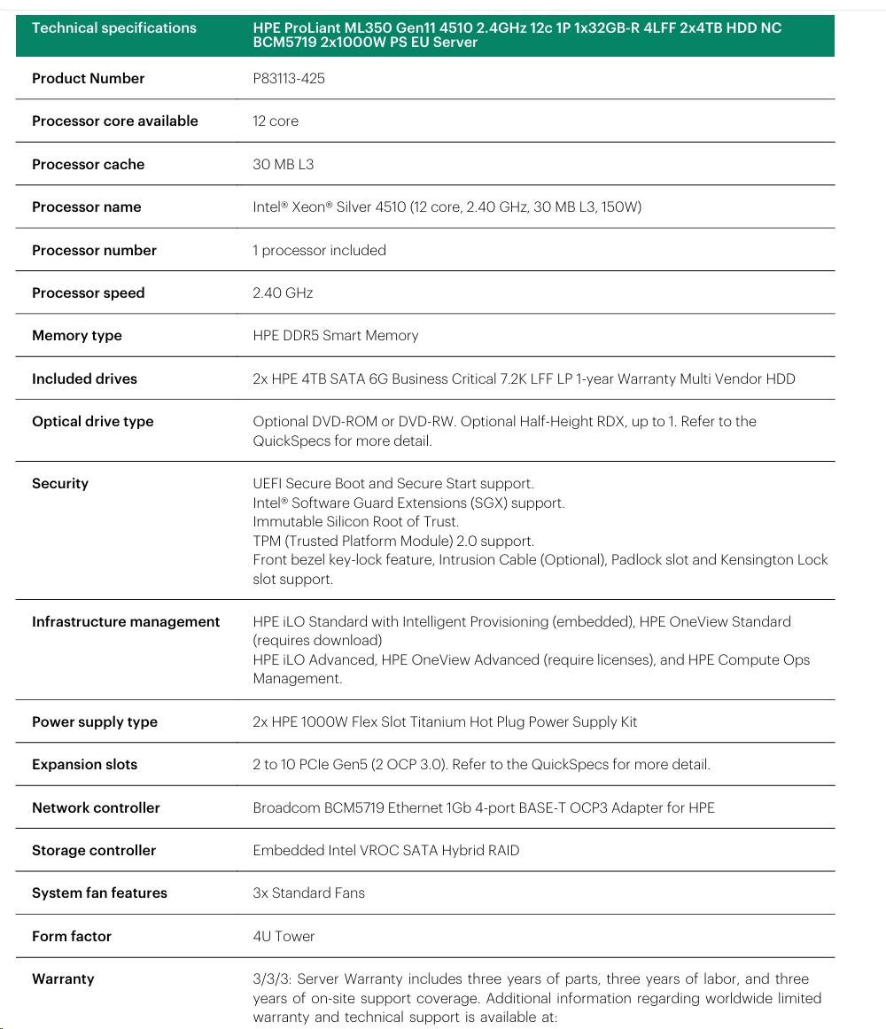 HPE PL ML350g11 4510 (2.4G/12C) 1x32G (P64706) 2x4TB/7.2k SATA LFF VROC 2x1000W 4p1G Smart Choice.