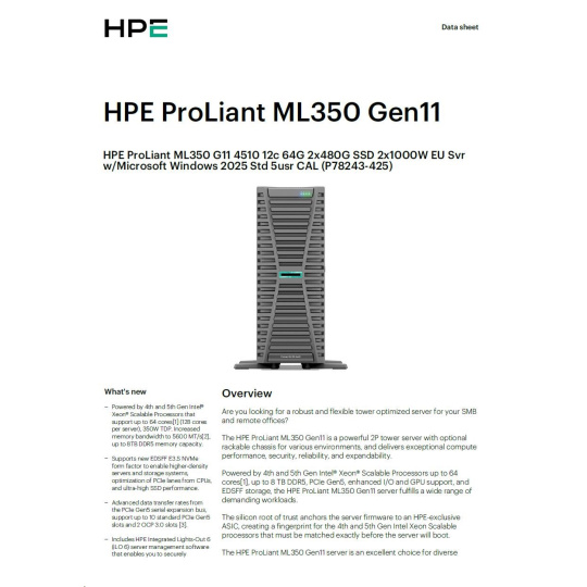HPE PL ML350g11 4510 (2.4/12C) 2x32G (P64706) 2x480G MR408i 2x1000W SFF 4p1G WS25STD(P77100) +5user(P77112) Smart Choice