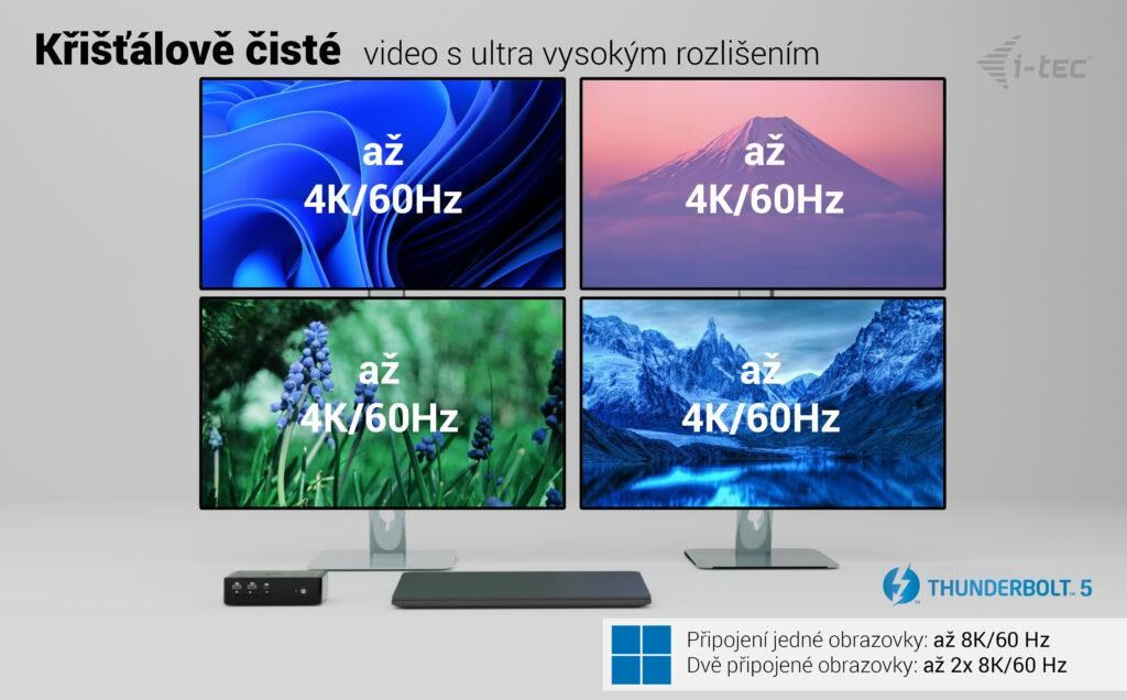 K notebookom s Thunderbolt 5 a Windows je možné pripojiť až štyri (v tomto prípade MUST byť zatvorené veko notebooku), k notebookom Apple s macOS potom maximálne dva monitory.