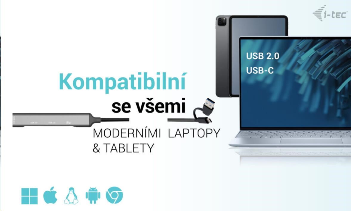 - HUB podporuje všetky bežné súčasné operačné systémy (Windows, macOS, Linux, Android, Chrome OS, iPadOS).