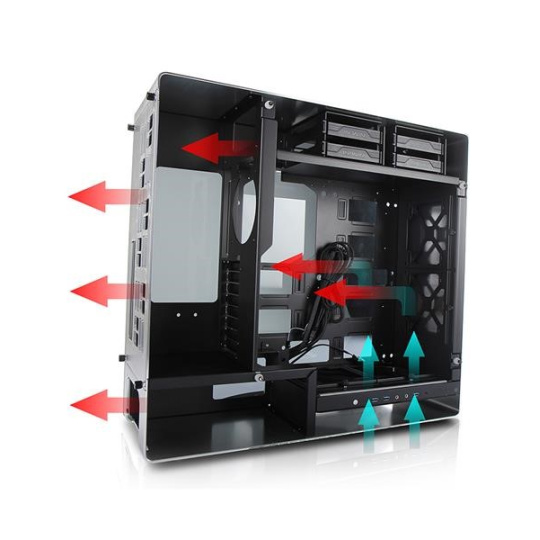 Oddelené pozície pre HDD a PSU zabezpečujú ideálne prúdenie vzduchu cez zadné vetracie otvory do vonkajšieho priestoru bez toho, aby teplému vzduchu bránili základné dosky alebo grafické karty.