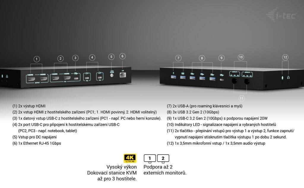 i-tec USB-C KVM Dock PRO pre tri hosty, Duálne video, s 2x Power Delivery, max 92W