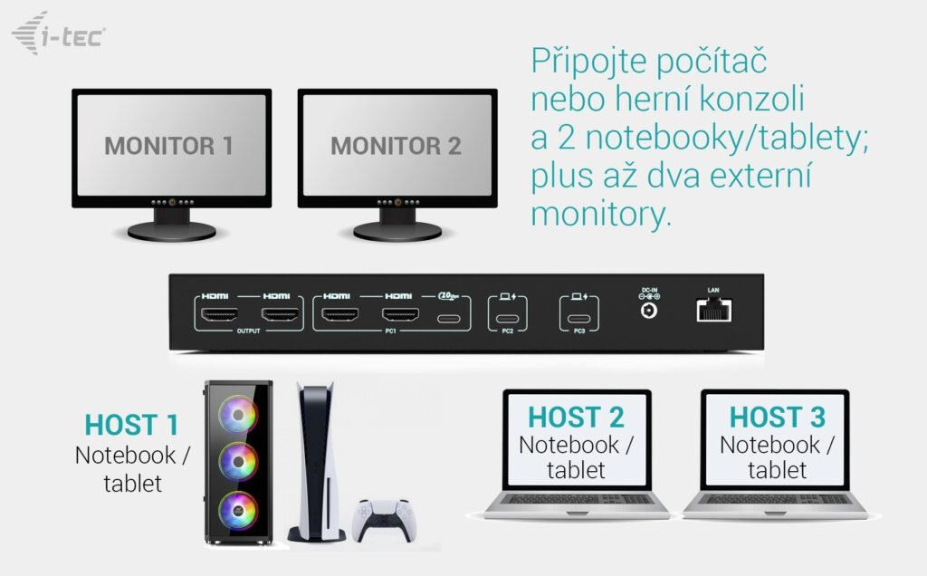 - Podpora až 3 hostiteľských zariadení (2× notebook/tablet + 1× herná konzola/PC)