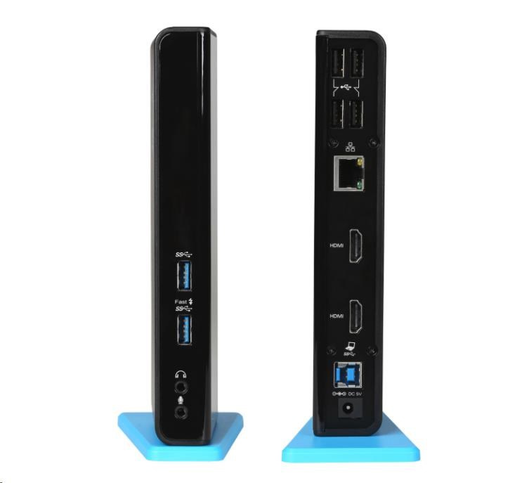 Stanica podporuje až 2x externý monitor, ktorý môžete pripojiť cez porty HDMI. 6x port USB, spoľahlivé a rýchle pripojenie k internetu vďaka integrovanému portu LAN a podpora zvukového vstupu a výstupu.