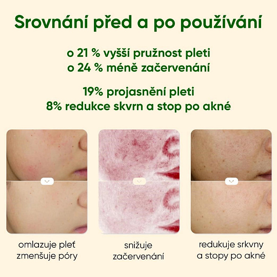 - Komplexné účinky: Redukuje pigmentáciu a začervenanie, lieči akné a jazvy, vyhladzuje vrásky, stiahnu póry a zvyšuje produkciu kolagénu a elastínu.
