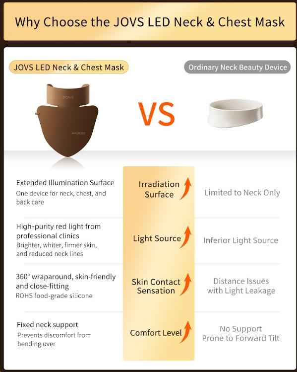 Zabudnite na neúčinné krémy a niekoľko rôznych prístrojov. Maska JOVS bola šikovne navrhnutá s rozšírenou osvetľovacou plochou, aby poskytla komplexnú starostlivosť nielen krku, ale aj dekoltu a hornej časti chrbta. Tieto oblasti sú rovnako ako tvár vystavené slnku a prejavom starnutia, ale často na ne zabúdame. S jedným zariadením tak môžete bojovať proti vráskam na krku, pigmentovým škvrnám v dekolte a nedokonalostiam na chrbte.