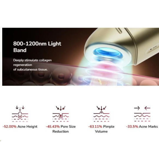 - Pásmo 800-1200nm: Preniká hlbšie do pokožky, kde pôsobí na mazové žľazy. Inhibuje ich nadmernú činnosť, vyrovnáva produkciu mazu a zabraňuje upchávaniu pórov. Zároveň stimuluje regeneráciu kolagénu, čo urýchľuje hojenie a zosvetľovanie jazvičiek po akné.