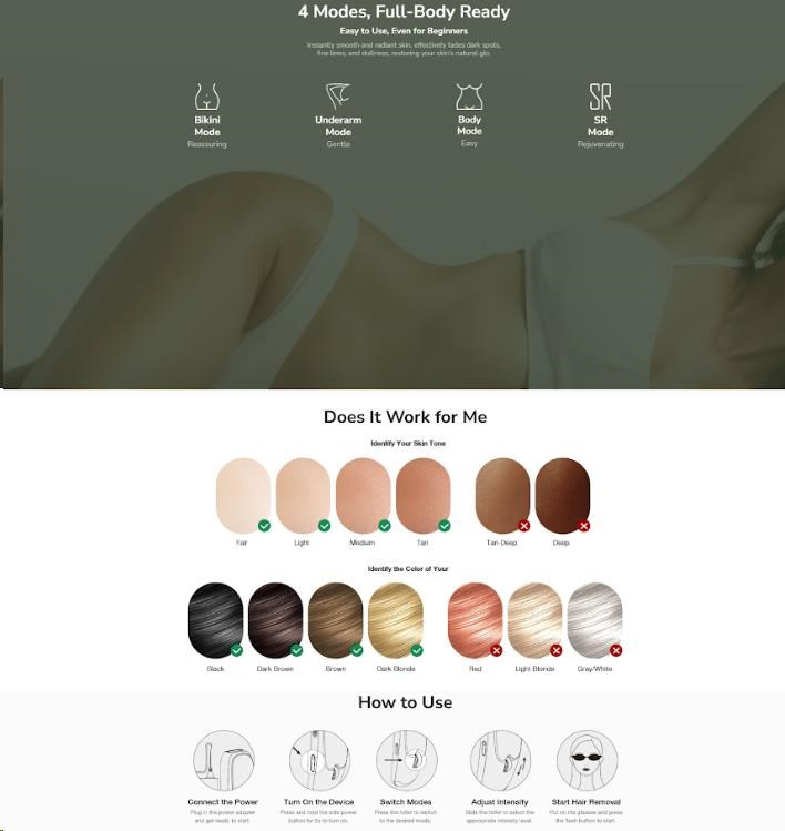 - Cielená starostlivosť pre celé telo: Niekoľko režimov a úrovní intenzity pre bezpečné ošetrenie nôh, rúk, podpazušia, oblasti bikín aj tváre.