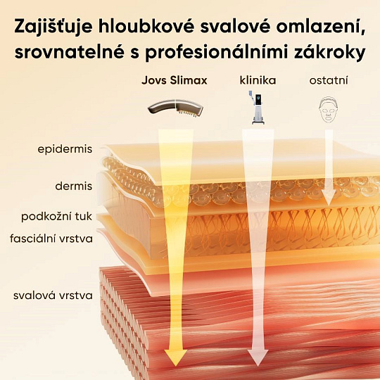 Väčšina kozmetických prístrojov sa zameriava len na dermis, teda na pokožku. Starnutie však začína hlbšie. Ak svaly pod kožou stratia svoju pevnosť, pokožka príde o svoju oporu a začne ochabovať a klesať – bez ohľadu na to, koľko kolagénu obsahuje. JOVS Slimax ako jediný využíva technológiu elektrických pulzných vĺn CET (Collagen Electrophoretic Techniques), ktorá vysiela signály priamo do svalovej vrstvy, stimuluje ich aktivitu a tým obnovuje pevný základ celej tváre.