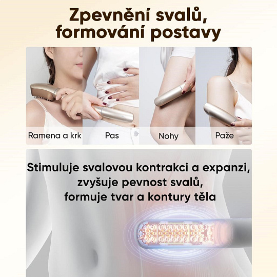 - Starostlivosť o telo (Režim SNE): Intenzívne pulzy simulujú masáž hlbokých tkanív, stimulujú svalové kontrakcie, a tým pomáhajú spevniť a vytvarovať problematické partie ako sú paže, brucho alebo stehno.