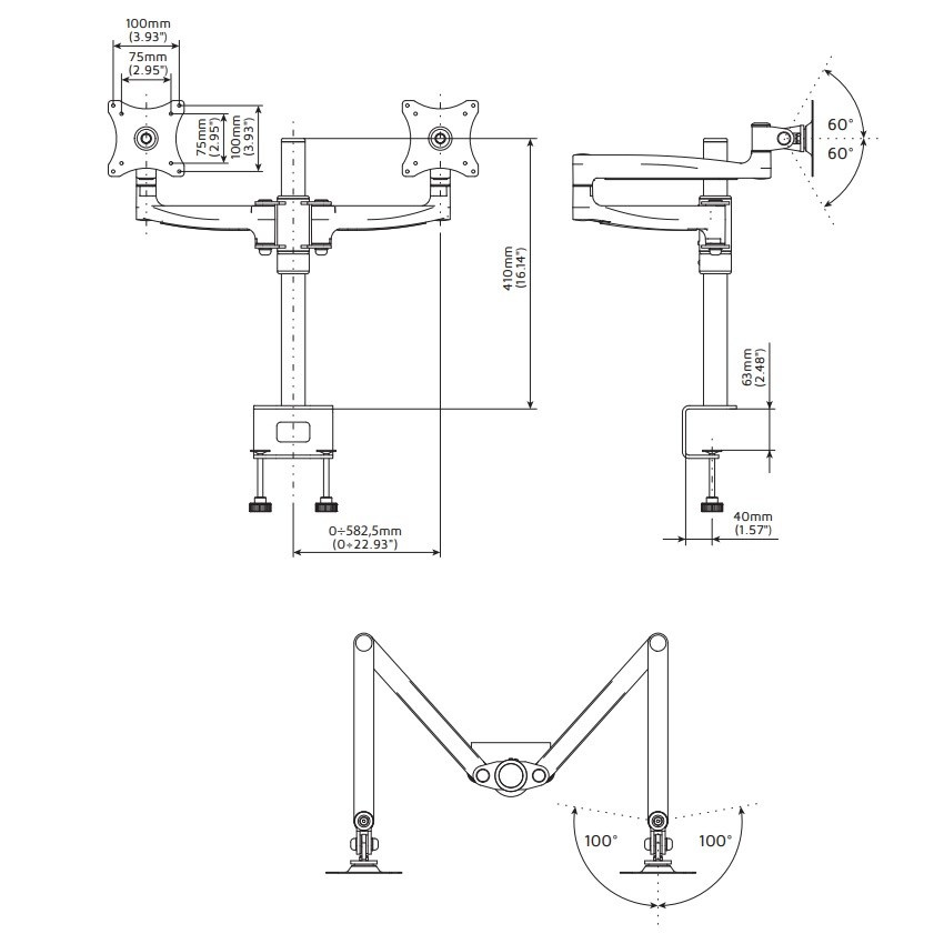 Kancelársky stolový držiak na 2 monitory Edbak DM121 Profesionálny kancelársky držiak na 2 monitory 17-27", otočný +/-180°, sklopný +/-60°, výškové nastavenie 100-405mm, dĺžka 0-582mm, pivot, 2 stolové úchyty, VESA 75x75 a 100x100, nosnosť 20kg Držáky značky Edbak vždy vynikali svojou kvalitou a nastaviteľnosťou, teraz aj so zameraním na dizajn, ktorý je reprezentatívny a nadčasový. Stolový držiak Edbak DM121 je vhodný na všetky typy a značky monitorov, ktorých uhlopriečka je 17" až 27". Držiak je plne nastaviteľný - otáčanie do strán, náklon, rotácia monitora (PIVOT), korekcia roviny, nastavenie výšky a vzdialenosti. Držiak podporuje VESA štandardy 75x75 a 100x100, nosnosť je 20kg. Farebné prevedenie matné čierne, materiál hliník. Záruka 10 rokov. Profesionálny kancelársky stolový držiak na dva monitory, plne nastaviteľný, najvyššia kvalita, nadčasový dizajn, záruka 10 rokov - Edbak DM121 Technické údaje: celková nosnosť 20kg (10kg na 1 monitor) podpora VESA štandardu 75x75 a 100x100 na všetky typy monitorov s uhlopriečkou 17"-27" otáčanie do strán +/- 180° názľon monitora +/- 60° nastavenie vzdialenosti od nosníka 0mm až 582mm nastavenie výšky 100mm až 405mm funkcia PIVOT - polohovanie monitora na šírku alebo do výšky súčasťou balenia sú 2 stolové úchyty - uchytenie na okraj stolu alebo do priestoru stola uchytenie na stolové dosky o hrúbke 10mm až 63mm krásny nadčasový dizajn, profesionálna kvalita a spracovanie ľahké nastavenie polohy monitorov materiál hliník + litina farebné prevedenie čierne záruka 10 rokov Profesionálny stolový držiak na 2 monitory, plne polohovateľný Edbak DM121 Držiak na 2 monitory Edbak DM121 podporuje VESA štandardy: VESA 75x75 VESA 100x100