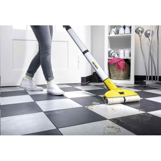 Vytierať stále čistou vodou? Bateriová podlahová myčka FC 3 Cordless sa o to postará. Nečistoty sú zhromažďované v nádobkách umiestnených za valcami. Rotujúce valce neustále zvlhčuje čistá voda, zatiaľ čo vytierané nečistoty sa dostanú do nádrže špinavej vody. Podlahy sú tak o 20 percent čistejšie ako pri použití bežného mop. Štíhla konštrukcia myčky FC 3 Cordless zabezpečuje bezproblémovú prácu aj pod nábytkom a jej pohodlné uloženie bez veľkých nárokov na miesto. Otočný kĺb sa postará o bezproblémové čistenie okrajov i rohov. Čas potrebný na uschnutie podlahy je iba približne 2 minúty, čím je možné túto myčku používať úplne bez starostí aj na tvrdé podlahy (napríklad aj na parkety). Výkonná lítiovo-iónová batéria poskytuje maximnú voľnosť pohybu, pretože je možné vytierať úplne nezávisle od zásuviek. A intuitívna LED kontrolka priebežne informuje o stave batérie.