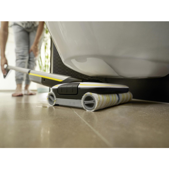 ** Čistič podláh Kärcher skracuje dobu upratovania až o 50 %, pretože bežné nečistoty z domácnosti je možné odstrániť z tvrdých podláh v jedinom kroku, bez potreby vysávania pred vytieraním.