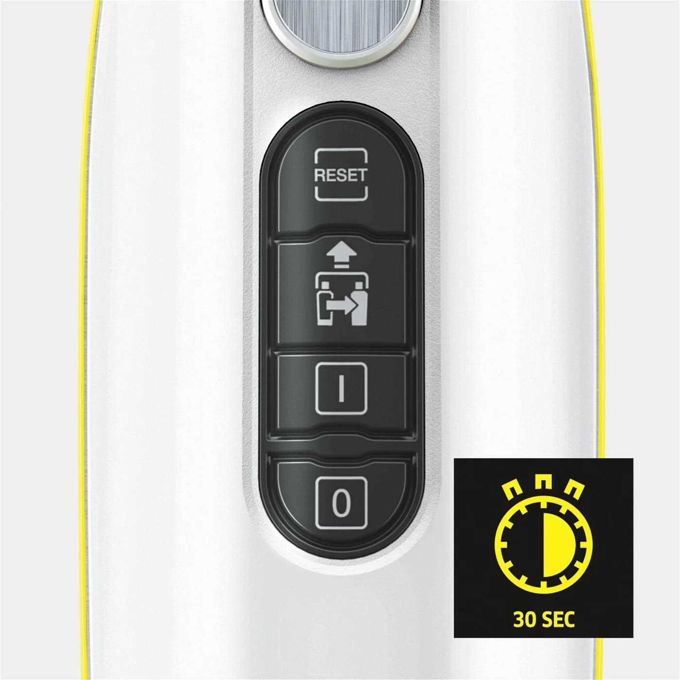 ** Pri dôkladnom čistení s parným čističom Kärcher bude 99,99 % všetkých bežných domácich baktérií zničených na štandardných hladkých tvrdých povrchoch v domácnostiach, ak bude rýchlosť čistenia 30 cm/s pri použití max. výkonu pár a dôjde k priamemu kontaktu s čistiacim povrchom (testovaný zárodok: Enterococcus hirae).
