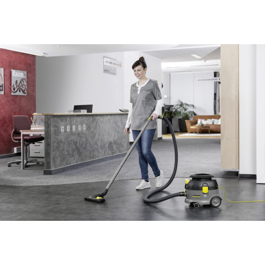 Odolný vysávač T 12/1 spoľahlivo odstráni odolnú špinu z kobercov aj tvrdých podláh. Pri vysávaní spôsobí minimum hluku (60 dB), takže je ideálny do hotelov, reštaurácií aj maloobchodu. Prístroj s príkonom 700 W vytvorí podtlak až 22 kPa, ktorému odolajú aj hrubé nečistoty. Dômyselný 6násobný filtračný systém zabezpečuje hygienické odstránenie prachu a dlhú výdrž vysokého sacieho výkonu. Omyvateľný filtračný kôš umožňuje vysávanie so sáčkom aj bez neho. Na požiadanie k vysávaču dodávame aj kvalitný HEPA filter pre ešte lepšie výsledky. Vysatý odpad sa ukladá do veľkej 12l nádoby odolnej voči nárazom. Komfort pri upratovaní zabezpečí dlhý 12m prívodný kábel a ergonomická rukoväť vysávača. Prístroj ľahko zapnete aj nohou a vďaka štvorici pogumovaných koliesok ho ľahko presuniete kamkoľvek je potrebné. A keď je všetko čisto lesklé, kábel, hubicu aj sacie trubky jednoducho upevníte ku telu vysávača, čím ušetríte miesto na uskladnenie.
