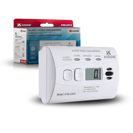 Detektor oxidu uhoľnatého (CO) Kidde K10LLDCO neustále monitoruje prítomnosť jedovacieho oxidu uhoľnatého v domácnostiach alebo prevádzkach, a tak poskytuje ochranu pred jeho smrteľnými účinkami. Okrem trojice kontrolných LED indikátorov disponuje tiež LCD displejom, na ktorom priebežne zobrazuje namerané hodnoty CO a ďalšie stavové informácie. Hlásič možno pevne nainštalovať na stenu alebo pre lepšie pohodlie jednoducho položiť na stôl, poličku alebo iný vodorovný povrch. Je ideálnym bezpečnostným prvkom a spoľahlivou ochranou pred týmto tichým zabijakom nielen pre domácnosti, ale aj v prenajatých ubytovacích priestoroch a ďalších objektoch. Schválením zodpovedá najnovším normám ČSN -EN50291:2018 pre domáce detektory oxidu uhoľnatého.