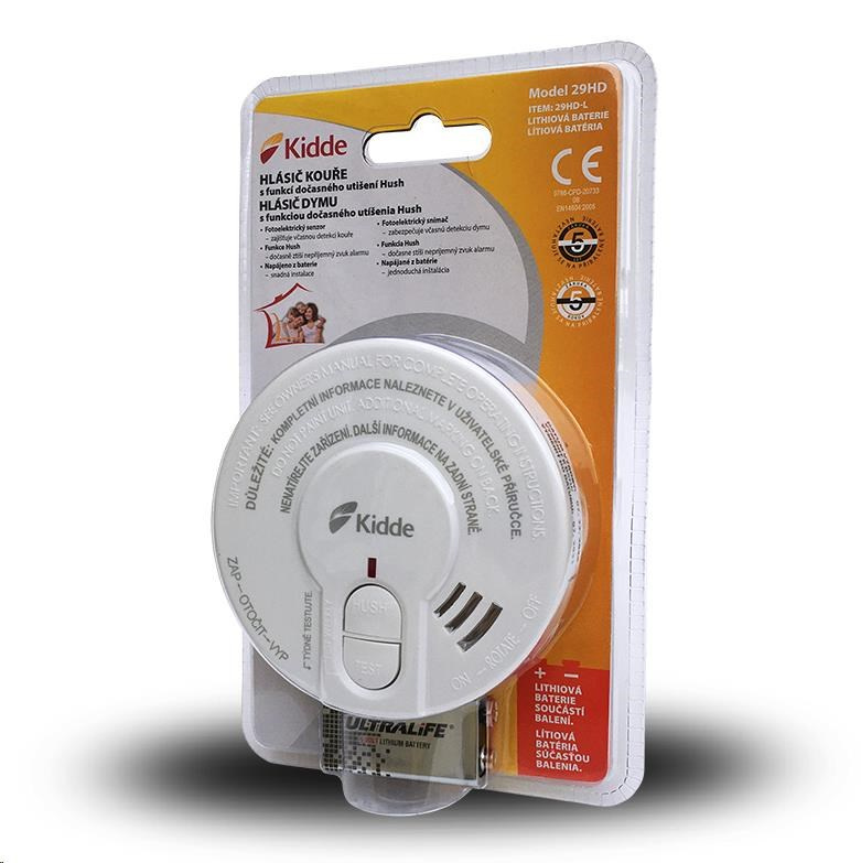 Hlásič požiaru je vybavený testovacím tlačidlom TEST na kontrolu správneho fungovania zariadenia a HUSH na dočasné umlčanie požiarneho hlásiča v prípade planého poplachu. Stlačenie tlačidla spôsobí okamžitú deaktiváciu alarmu, na približne 10 minút, zníženie citlivosti obvodov a vypnutie akustickej signalizácie hlásiča. Tlačidlo HUSH používajte iba v prípade, že poznáte príčinu aktivácie hlásiča (napríklad pri varení alebo smažení). Po cca 10 minútach od deaktivácie hlásiča sa tento úplne automaticky resetuje do pôvodného nastavenia pre monitorovanie nebezpečenstva požiaru. Ak zostane v miestnosti vysoká koncentrácia dymu, môžete stlačiť tlačidlo HUSH opakovane až do okamihu, keď je miestnosť riadne odvetraná. Tento model je vybavený najmodernejším fotoelektrickým sensorom Kidde.
