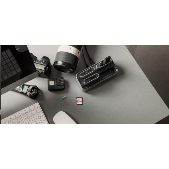 Workflow Station a čítačky spoločnosti Kingston poskytujú flexibilný systém na prenos videa, fotografií a zvuku z viacerých zdrojov naraz.* Urýchlite svoj postprodukčný pracovný postup a vytvorte si nastavenie na odosielanie súborov, ktoré vyhovuje vašim potrebám. Dokovacia stanica Workflow Station Dock sa dá prispôsobiť, takže môžete používať len USB miniHub, čítačky SD alebo microSD, ktoré si vyžaduje vaše snímanie. Či už natáčate viacero kamier v rozlíšení 4K/8K s prenosnými zvukovými rekordérmi pre každého hostiteľa, alebo natáčate B-Roll s dronmi a GoPros, k doku môžete súčasne pripojiť až štyri čítačky a rýchlo prenášať zábery. Zariadenie Workflow Station a čítačky podporujú rozhranie USB 3.2 rýchlosti, vďaka ktorým sa dostanete k postprodukčnému procesu rýchlejšie ako kedykoľvek predtým. Čítačky kariet sa dajú používať aj na cestách, čo zvyšuje ich flexibilitu. Keď potrebujete fotografovať na mieste, jednoducho si vložte potrebný rozbočovač alebo čítačky do tašky a pripojte ich k notebooku pomocou priloženého kábla USB-C®.