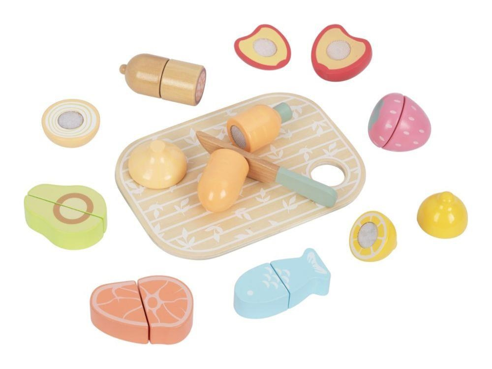 Sada drevených krájacích potravín uložená v praktickom a ľahko prenosnom boxe 3v1 umožní deťom pripraviť hostinu doma aj na návšteve. Krájacie ovocie, zeleninu a ďalšie potraviny môžu deti pomocou dreveného noža krájať (porciovať) na polovice a pomocou suchého zipsu polovice opäť spájať. S krájacími potravinami si deti vyskúšajú krájanie bezpečným detským spôsobom a zdokonalia svoje zručnosti.