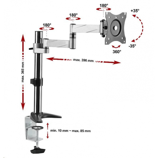 Technické údaje: nosnosť 8kg plne nastaviteľný - 3D polohovanie monitora pre monitory s uhlopriečkou 13" až 27" podpora VESA 75x75 a 100x100 otáčanie do strán +/- 180° nakoľko +/- 35° rotácia obrazovky +/- 180° - funkcia PIVOT nastavenie vzdialenosti od nosníka 0mm až 396mm nastavenie výšky max. 364mm ukotvenie na stolové dosky s priemerom 10mm až 85mm dva typy ukotvenia na stolové dosky - svorka na okraj stola alebo skrz dosku kamkoľvek do priestoru krásny vzhľad - chrómový nosník, ramená v striebornej úprave materiál hliník výborná kvalita, spoľahlivosť a dlhá životnosť inštalačný materiál súčasťou balenia záruka 3 roky