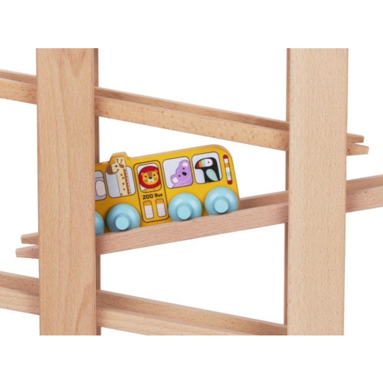 Drevená gulôčková dráha XL s originálnymi prvkami v podobe skvelého závodného autíčka a autobusu so zvieratkami zo ZOO ZDARMA nadchne každé dieťa. Gulôčková dráha z tvrdého prírodného dreva s 7 zábavnými prvkami v krásnych farbách zabezpečí zábavu nielen vašej holčičke alebo chlapcovi, ale aj celej rodine. Stačí správne umiestniť guľôčku, kvetinu, závodničku alebo bus na začiatok dráhy a potom len sledovať, akou rýchlosťou zdolá všetky poschodia.