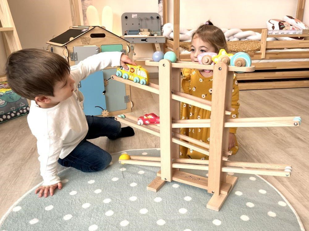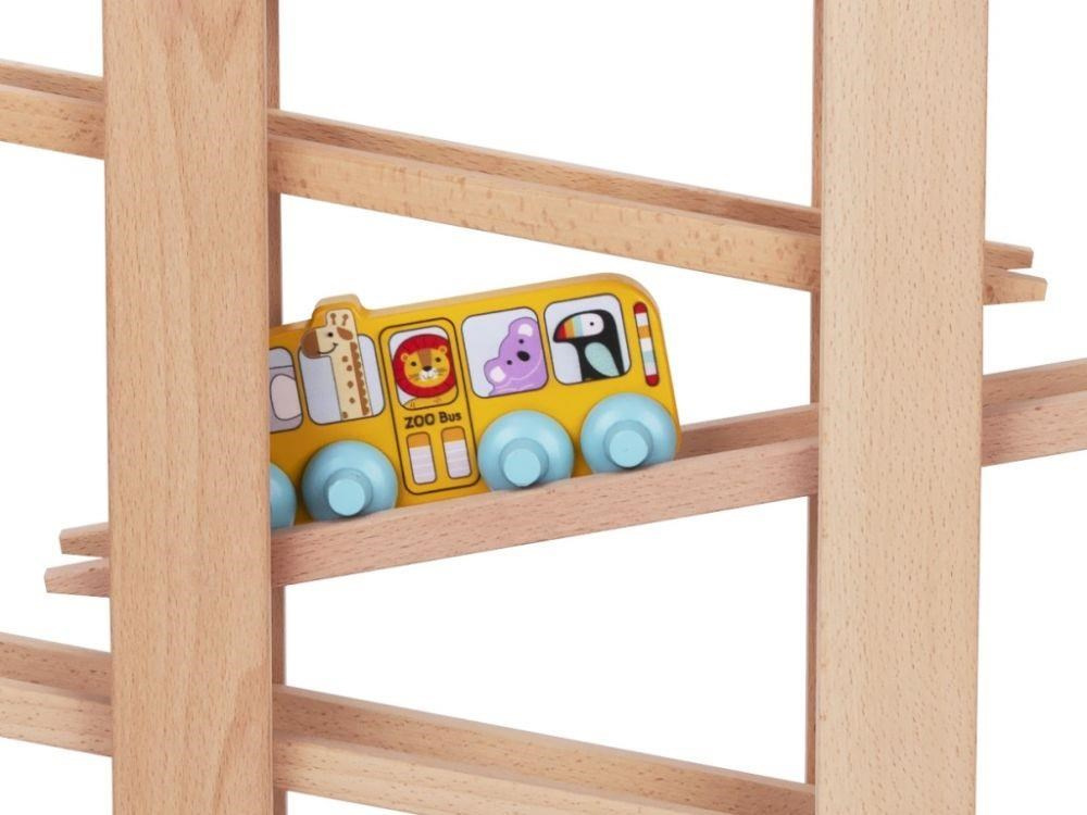 Drevená gulôčková dráha XL s originálnymi prvkami v podobe skvelého závodného autíčka a autobusu so zvieratkami zo ZOO ZDARMA nadchne každé dieťa. Gulôčková dráha z tvrdého prírodného dreva s 7 zábavnými prvkami v krásnych farbách zabezpečí zábavu nielen vašej holčičke alebo chlapcovi, ale aj celej rodine. Stačí správne umiestniť guľôčku, kvetinu, závodničku alebo bus na začiatok dráhy a potom len sledovať, akou rýchlosťou zdolá všetky poschodia.