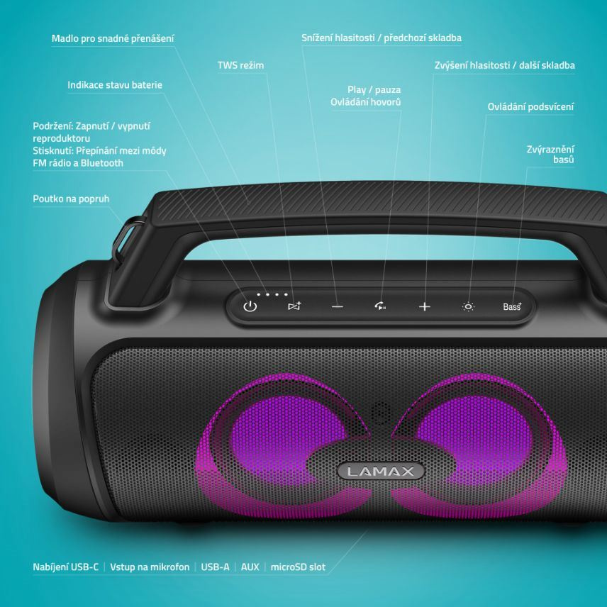 Udávaj tón každej party s prenosným reproduktorom LAMAX PartyGo1 Play. Jeho neveľké telo so šikovným madlom ukrýva značný výkon 50 W. Kdekoľvek si len spomenieš, naservíruje ti silný, plný a bohatý zvuk vďaka technológii BeatBass®. Či už sa jedná o poriadnu párty alebo záhradnú grilovačku, vždy im dodajú ten správny vibe aj 3 režimy LED podsvietenia a pribalený mikrofón, s ktorým si užiješ super karaoke alebo môžeš akciu moderovať. Bluetooth 5.3 zariadi okamžité spárovanie repráku s akýmkoľvek zariadením a istotu bezchybného prenosu až na 18 m. Pripojiť ho možno ale aj cez USB, microSD, prípadne AUX a vie sa premeniť v powerbanku cez USB-A vstup. Poriadnu muziku si užiješ aj na cestách, batéria repráku vydrží až 15 hodín a vďaka praktickému popruhu si ho pohodlne hodíš cez rameno. Pokiaľ je jeden reprák málo, pomocou True Wireless technológie ho pohodlne spáruješ s ďalším. Nemáš práve po ruke svoj playlist? Využi FM rádio, ktorý ľahko naladíš. Reproduktor podporuje hlasových asistentov a ovládneš s ním aj telefónne hovory.