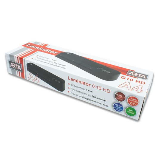 Laminátor dokumentov s možnosťou voľby hrúbky laminovacej fólie. Model ARTA G10 HD A4 umožňuje laminovanie dokumentov, ktoré majú maximálnu šírku 235 mm (A4), s fóliami o hrúbke 75 až 250 mikrónov. Doba potrebná na zohrievanie je iba 60 sekúnd. Je ľahko použiteľný, malý, kompaktný a vyniká prítomnosťou inteligentnej funkcie automatického vypnutia po 30 minútach nečinnosti. Súčasťou je tiež možnosť uvoľnenia zaseknutých dokumentov.