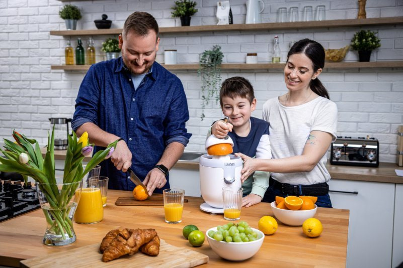 Šťava plná vitamínov jednoducho a rýchloZástancovia zdravého životného štýlu by vo svojej domácnosti nemali chýbať pomocník v podobe elektrického citrusovača Lauben Electric Citrus Juicer 110WT. Jeho čistý dizajn ozdobí každú kuchynskú linku, ktorú vďaka funkcii Anti Drip nepoškvrní ani kvapkou šťavy. Funkcia proti odkvapkávaniu zabezpečuje, že džús prúdi priamo do pohára alebo zostáva v zásobníku. Rýchlosť otáčok pri odšťavovaní je nastavená tak, aby si šťava uchovala maximum vitamínov. Chuť navyše nie je nijak ovplyvnená, pretože časti prichádzajúce do kontaktu s ovocím sú nerezové alebo z plastu splňujúceho najprísnejšie nariadenia EÚ a neuvoľňujú žiadnu pachuť ani arómu. Tvar kužeľa a nastaviteľná páka proces odšťavovania zefektívňujú a tichý chod umožňuje prípravu džúsu hocikedy. Bezpečný chod zabezpečujú protisklzové nožičky a poistka znemožňujúca spustenie, ak lis nie je riadne zostavený. Určite poteší aj ľahká údržba, odnímateľné časti stačí vložiť do umývačky.