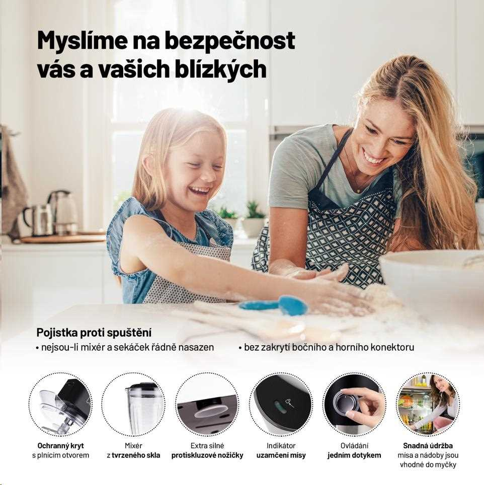 Bezpečnosť by pri varení a príprave potravín mala byť vždy na prvom mieste. Mysleli sme na to aj pri vývoji tohto kuchynského robota. Vďaka poistke sa robot nikdy nespustí, ak nie je správne uzatvorený. Disponuje i poistkou proti prehriatiu a extra silnými protišmykovými nožičkami, ktoré sa postarajú o to, aby robot zostal na svojom mieste.