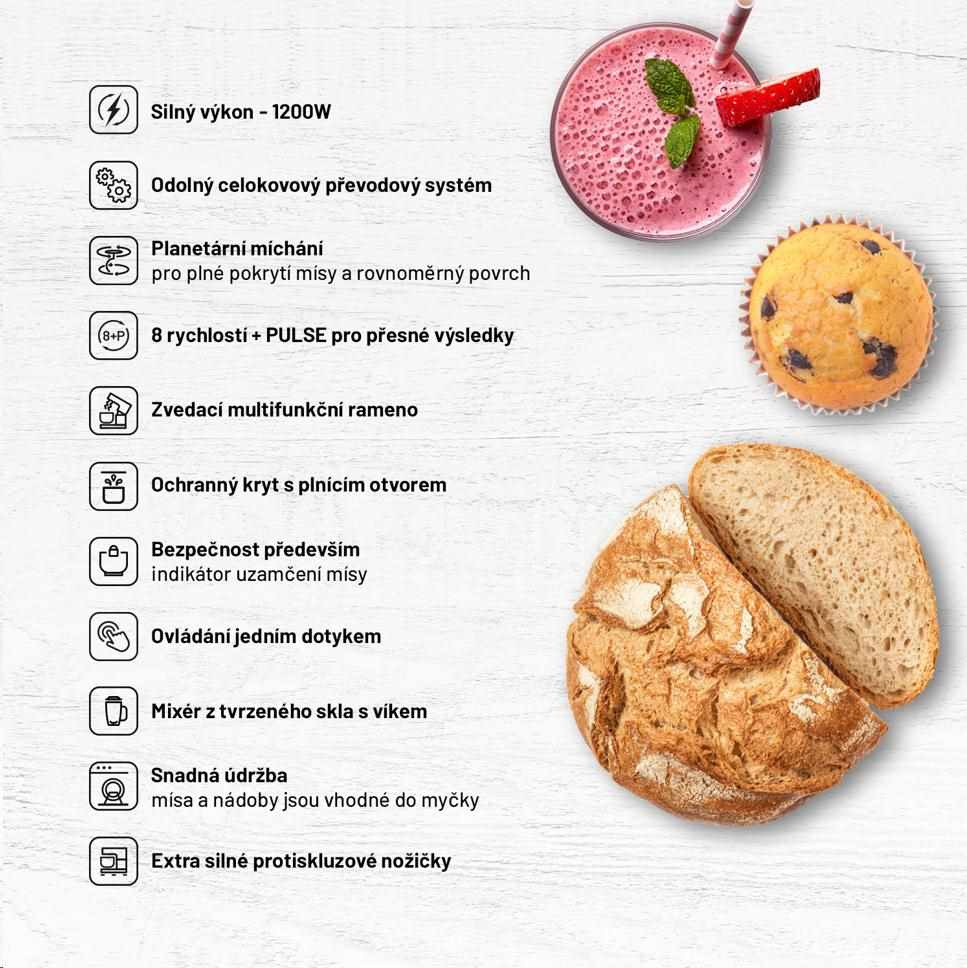 Váš kuchynský superhrdinaLauben Kitchen Machine 1200BC je kuchynský robot s bohatým príslušenstvom, vďaka ktorému sa miesto vás hravo postará o množstvo kuchynských práci a zároveň vám ušetrí miesto v kuchyni. Hanbu vám v kuchyni neurobí ani vzhľadom, čo dokladá prestížne dizajnové ocenenie IF Design Award 2019. Miešanie, šľahanie, miesenie cesta i mletie mäsa, o to všetko sa spoľahlivo postará spoľahlivý medený motor s výkonom 1200 W a vysokozáťažové celokovové prevody. Robot disponuje technológiou EffectiMix® , ktorá zaisťuje planetárny mixovací pohyb a rovnomerný výsledok. Vďaka systému SpeedPrecision® máte na výber z 8 presne kalibrovaných rýchlostí a možnosti PULSE pre presné výsledky. Hlavná mixovacia nádoba je vyrobená z nerezovej ocele a má kapacitu 5l. Robota sme doplnili mixovacím pohárom z tvrdeného skla s vekom pre pridávanie ingrediencií. Môžete ho tak využiť pri príprave studených či vlažných polievok alebo čerstvých smoothies. Bezpečnosť je vždy na prvom mieste, preto je Lauben Kitchen Machine vybavený poistkou, ktorá ho spustí, iba ak je správne uzatvorený, protišmykovými nožičkami a poistkou proti prehriatiu. Správne usadenie misy bude hračka vďaka farebnému indikátoru. Robot vás poteší aj jednoduchým ovládaním pomocou jediného tlačidla, nízkou hlučnosťou a dvoma farebnými prevedeniami. Pretože veľmi dobre vieme, že nie je jednoduché každý deň vymýšľať, čím nakŕmite rodinu alebo seba, pridali sme do balenia kuchárku s receptami pre inšpiráciu.