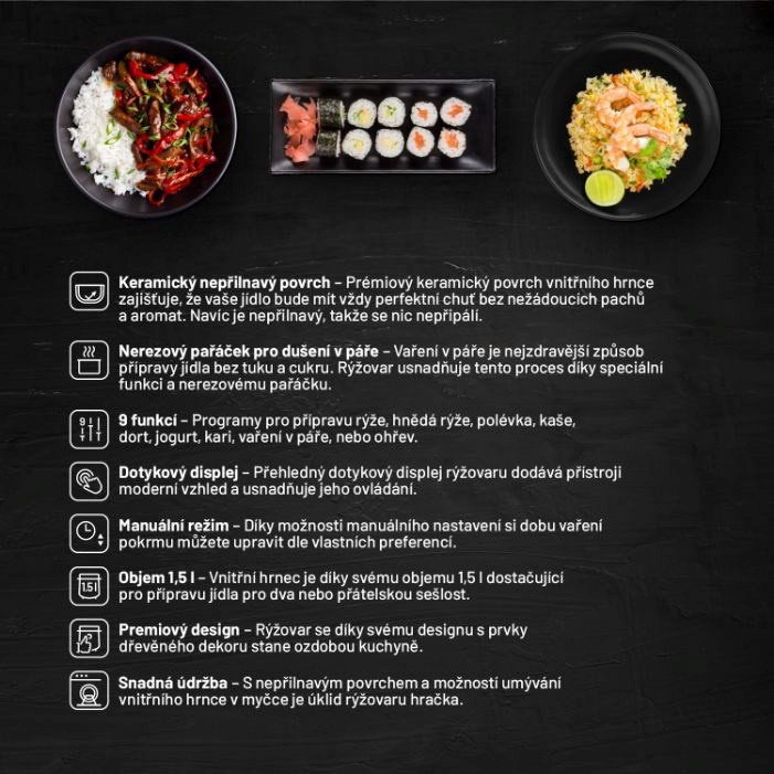 Premeniť varenie na zábavu, ktorá navyše zaberie minimum času, je teraz vďaka Lauben Multifunction Rice Cooker 1500BW jednoduchšie než kedykoľvek predtým. Všeúčelový rýžovar s keramickým nepriľnavým povrchom vnútorného hrnca o objeme 1,5 l sa stane dokonalým pomocníkom na ceste k zdravému životnému štýlu. Jeho 9 prednastavených programov si poradí s prípravou rôznych pokrmov, ktoré aj začiatočník uvarí ako šéfkuchár. Pomocou nerezového parníka na dusenie v pare môžete variť ešte zdravšie, a to stlačením jediného tlačidla. Ak vám však program nevyhovuje, pohodlne si všetko nastavíte aj manuálne. Manipuláciu a ovládanie uľahčuje dotykový displej a technológia Cool Touch, ktorá je zároveň bezpečnostným prvkom na zabránenie popálenín. Užívateľsky prívetivá údržba, keď stačí vnútorný hrniec vložiť do umývačky riadu, tak tiež ušetrí veľa času. Prémiový dizajn s dreveným dekorom ozdobí každý interiér.
