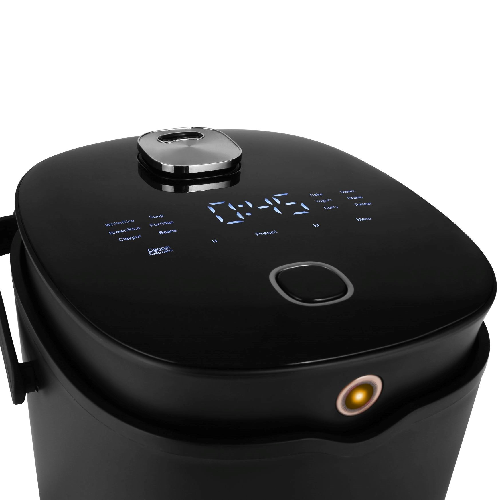 Ovládanie viacúčelového rýžovaru zvládne úplne každý pomocou prehľadného dotykového displeja, kde stlačením tlačidla aktivujete zvolenú funkciu alebo si manuálne nastavíte hodnoty podľa potreby. Manipuláciu s rýžovarom uľahčuje praktické madlo. Vo 2l hrnci s nepremastiteľným povrchom pohodlne pripravíte jedlo pre celú rodinu či spoločenskú akciu. Stačí ho potom vybrať a vložiť do umývačky, žiadne zložité drhnutie. Súčasťou balenia je tiež praktická odmerka a lyžica na ryžu.