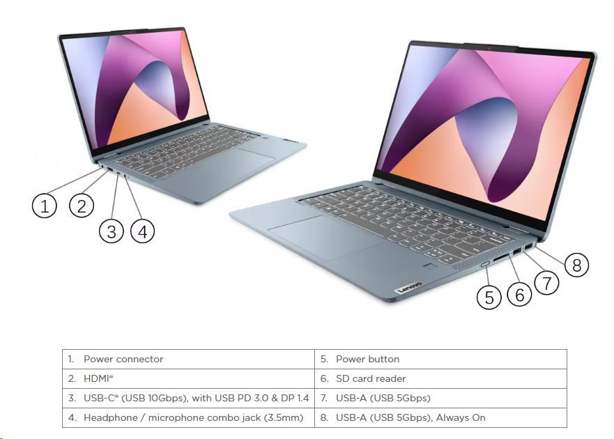 Standartné porty | 1x USB-A (USB 5Gbps / USB 3.2 Gen 1) 1x USB-A (USB 5Gbps / USB 3.2 Gen 1), Always On 1x USB-C® (USB 10Gbps / USB 3.2 Gen 2), with USB PD 3.0 and DisplayPort™ 1.4 1x HDMI® 1.4b 1x Headphone / microphone combo jack (3.5mm) 1x SD card reader 1x Power connector |