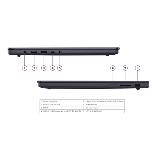 | Standartné porty | 2x USB-A (USB 5Gbps / USB 3.2 Gen 1) 1x USB-C® (USB 5Gbps / USB 3.2 Gen 1), with USB PD 3.0 and DisplayPort™ 1.2 1x HDMI® 1.4 1x Headphone / microphone combo jack (3.5mm) 1x SD card reader 1x Power connector |