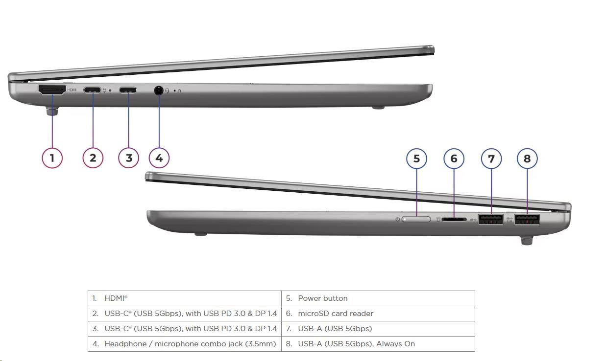 | Standartné porty | 1x USB-A (USB 5Gbps / USB 3.2 Gen 1) 1x USB-A (USB 5Gbps / USB 3.2 Gen 1), Always On 2x USB-C® (USB 5Gbps / USB 3.2 Gen 1), with USB PD 3.0 and DisplayPort™ 1.4 1x HDMI® 1.4b 1x Headphone / microphone combo jack (3.5mm) 1x microSD card reader |